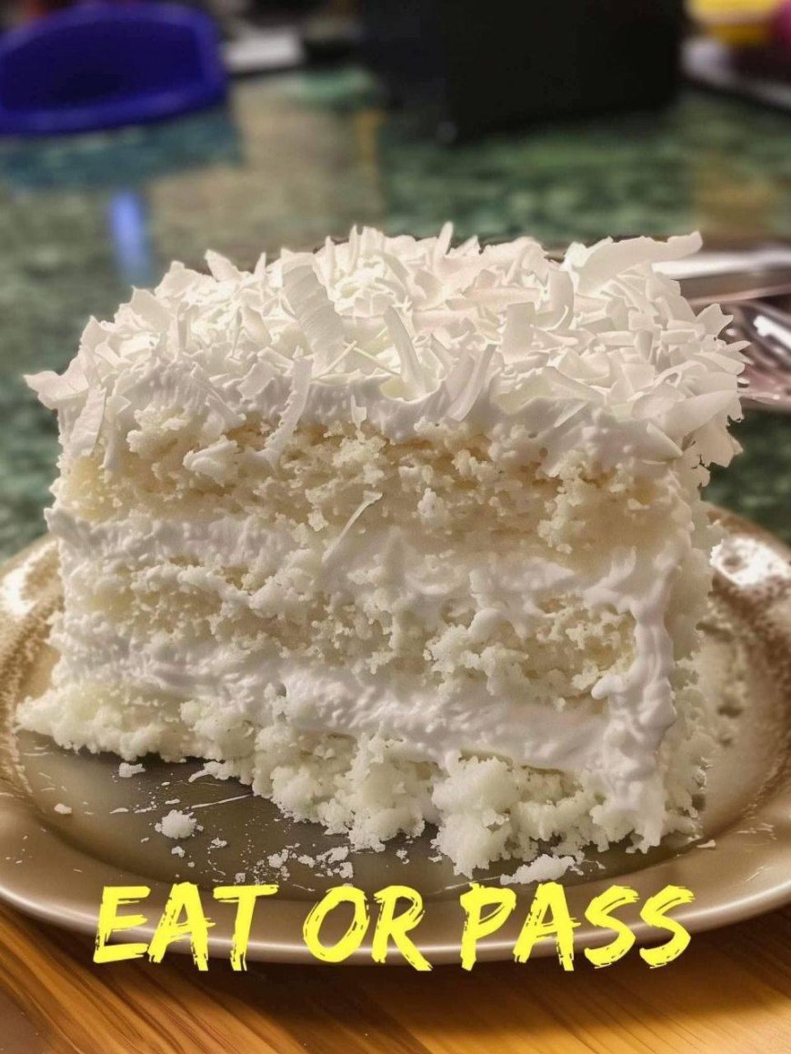and then there are desserts that feel like a moment — a moment of comfort, nostalgia, indulgence, and pure satisfaction all wrapped into one. The cake in the photo belongs to that second category. One look at its snowy white layers, soft as clouds and generously wrapped in creamy frosting and delicate coconut flakes, tells you this isn’t just any homemade treat. It’s the kind of cake that whispers celebration, warmth, and a promise of sweetness that melts gently on the tongue.