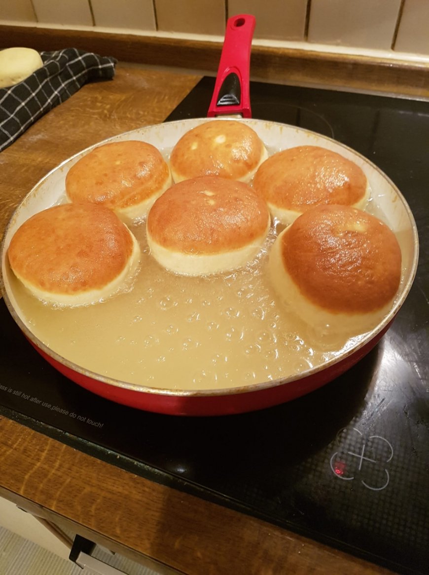 4. Jetzt die Krapfen mit der Oberseite nach unten vorsichtig ins Fett gleiten lassen und zudecken. Etwa