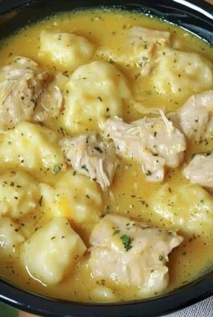 Chicken and Dumplings. This traditional recipe combines tender pieces of chicken simmered in a rich, flavorful broth with light, fluffy dumplings that melt in your mouth. It’s a dish that feels like home — hearty, creamy, and deeply satisfying.