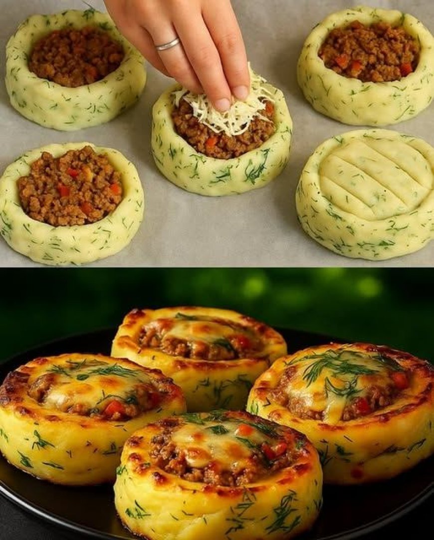 These beautiful stuffed mashed potato nests are the perfect combination of creamy potatoes, savory ground meat, melted cheese, and fresh herbs. With their elegant shape and rich filling, they make a wonderful main course for family dinners, special occasions, or when you simply want to serve something comforting and visually stunning. The outer layer is made from a buttery, dill-infused mashed potato mixture, shaped into nests and filled with a flavorful minced meat mixture. Once baked, they develop a golden crust and melt-in-the-mouth texture.